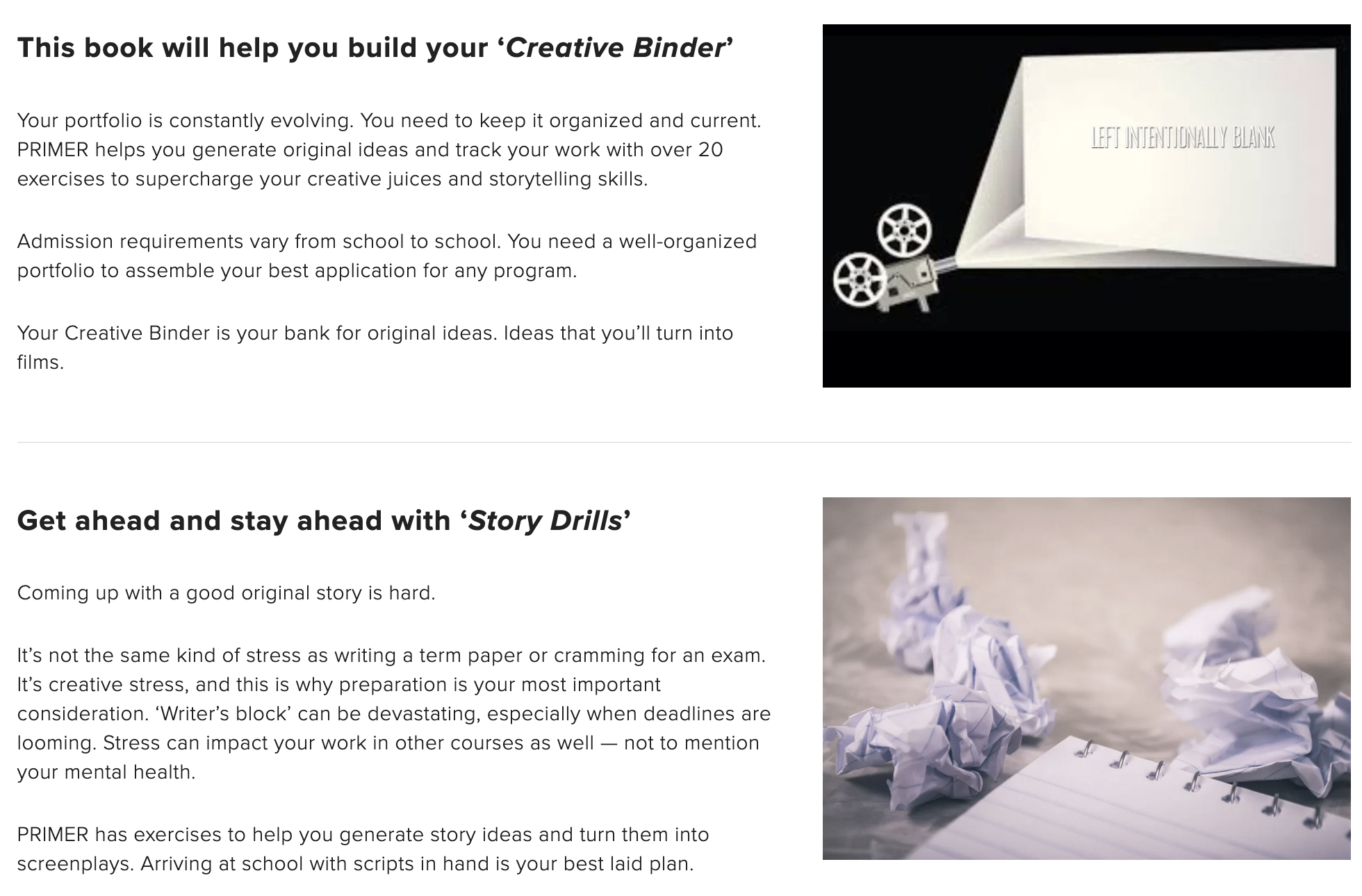 Your portfolio is constantly evolving. You need to keep it organized and current. PRIMER helps you generate original ideas and track your work with over 20 exercises to supercharge your creative juices and storytelling skills.