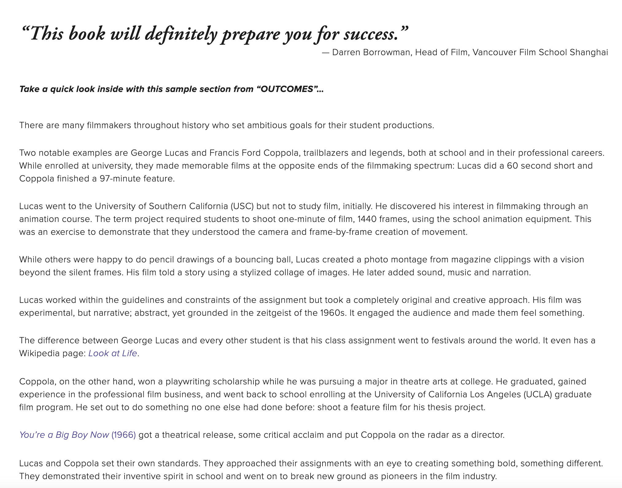 Lucas and Coppola set their own standards. They approached their assignments with an eye to creating something bold, something different. They demonstrated their inventive spirit in school and went on to break new ground as pioneers in the film industry.