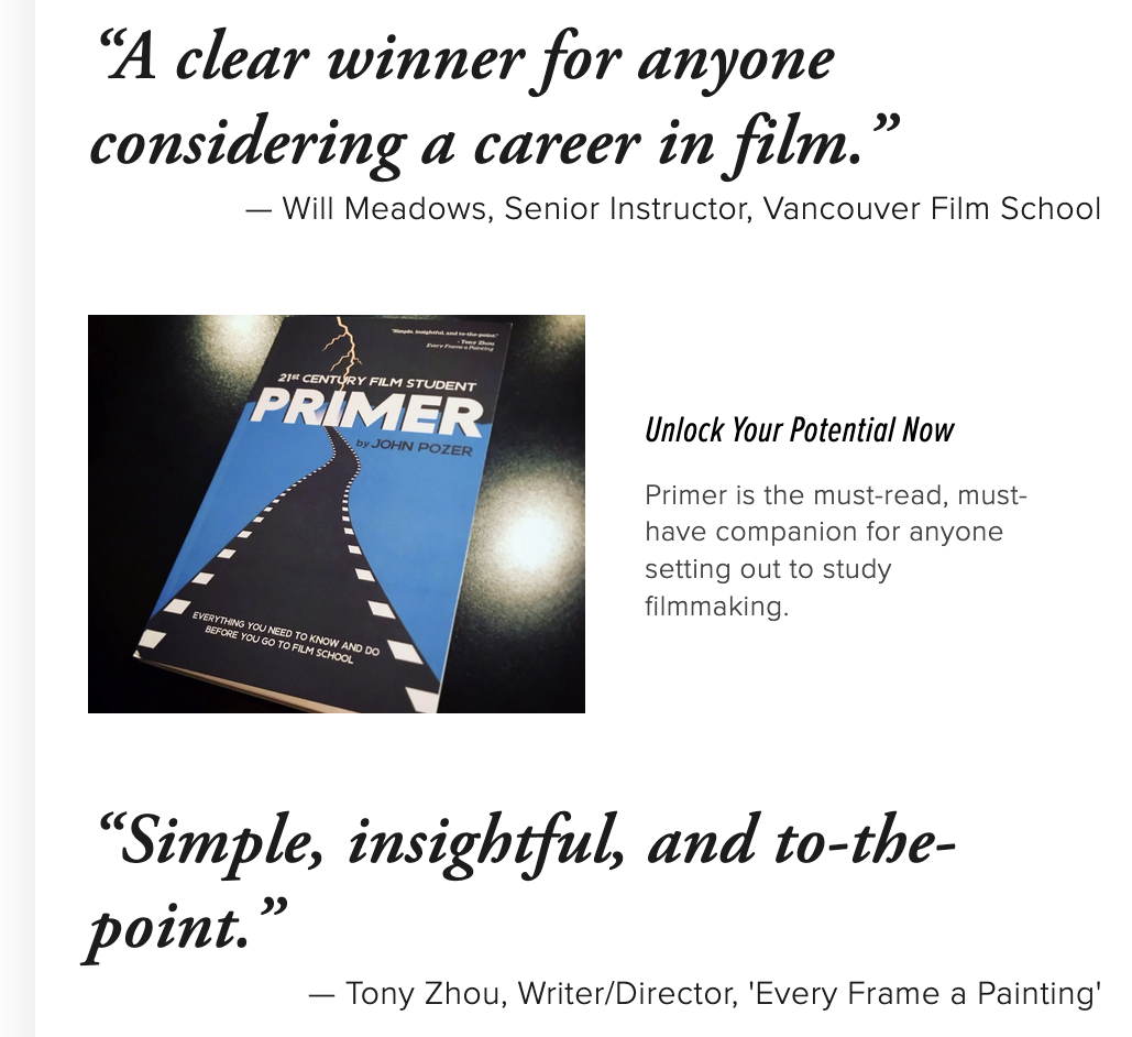 Film schools want successful students and PRIMER provides a practical approach for your scholastic achievement. Follow time-tested advice and make the most out of your creative efforts.